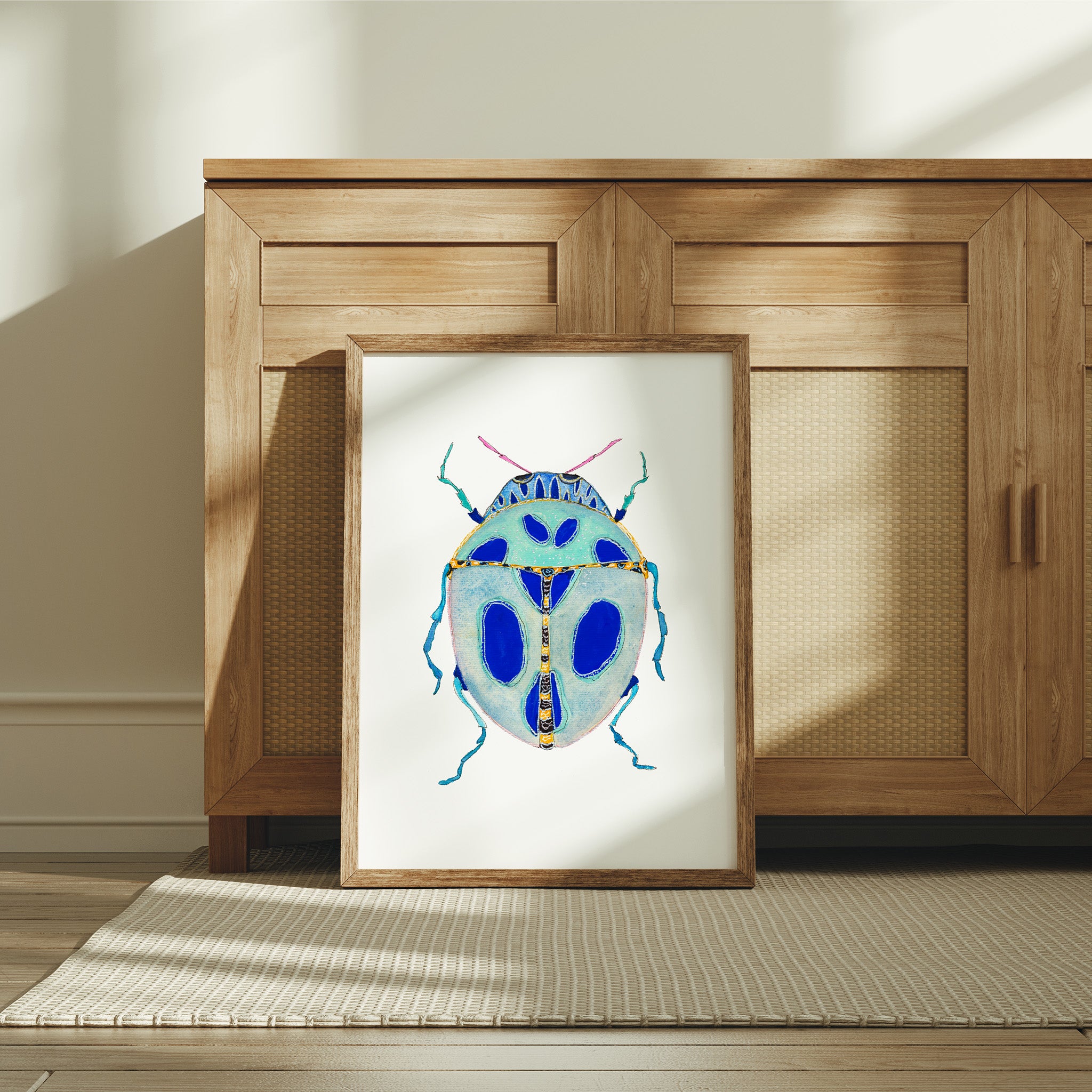 This is an archival fine art print of my original watercolor Blue Beetle No. 9 painting.We offer in-house framing using real oak wood (natural, walnut, or white) or gold metal and all frames come with crystal-clear tempered glass. Framed prints arrive at your door fully framed and ready to hang with all necessary hardware.For unframed prints, all size options are standard and come ready to be placed into any standard frame.Each print is made with archival pigment-based ink on 100% cotton paper.Unframed prints are thoughtfully packaged with firm backing board in a clear protective sleeve. Larger prints are shipped in a sturdy mailing tube.Framed prints are carefully double-boxed with bubble wrap to amply protect the frame and glass while on the shipping journey.