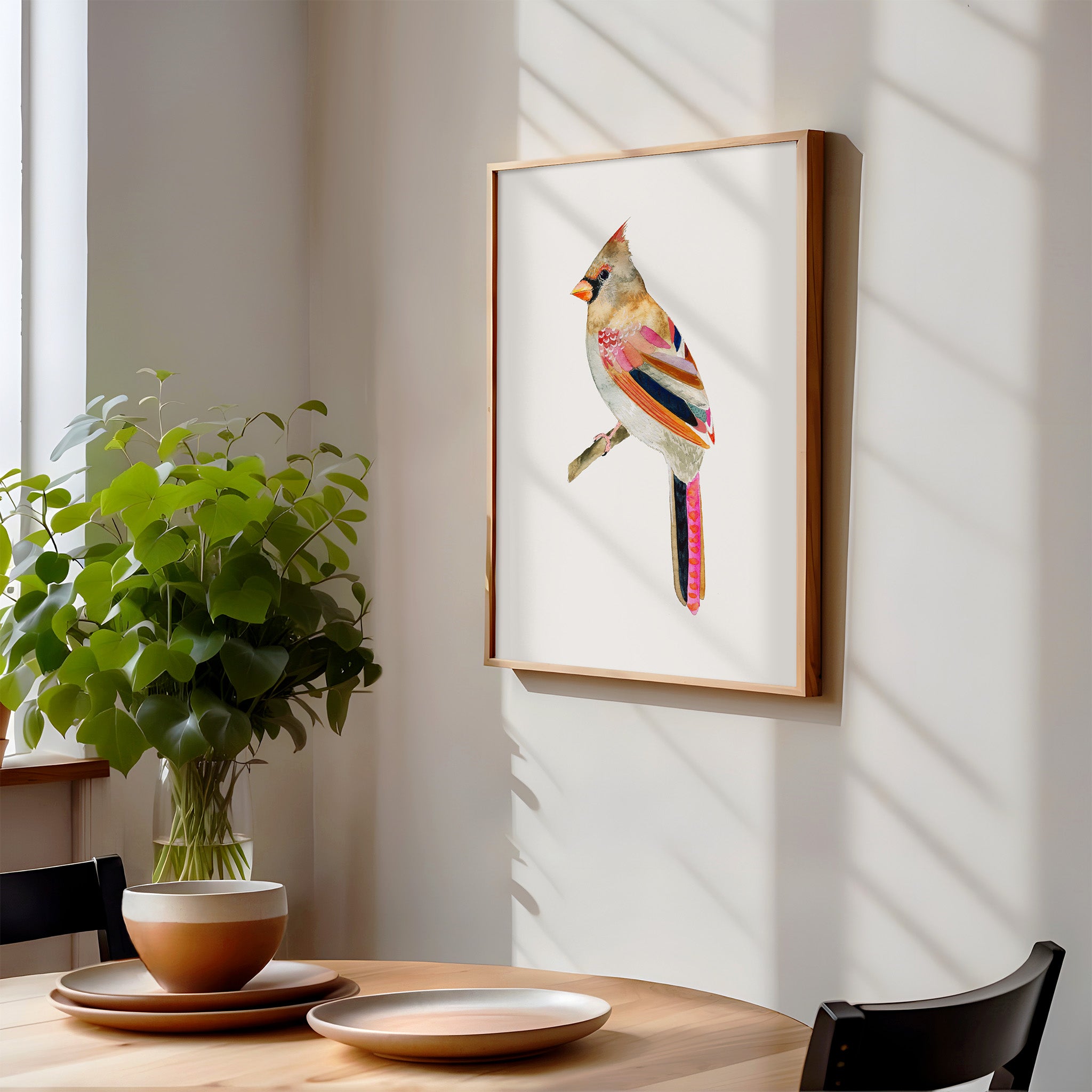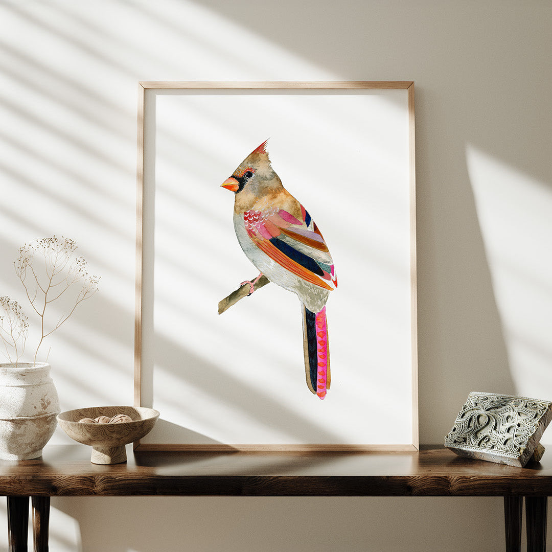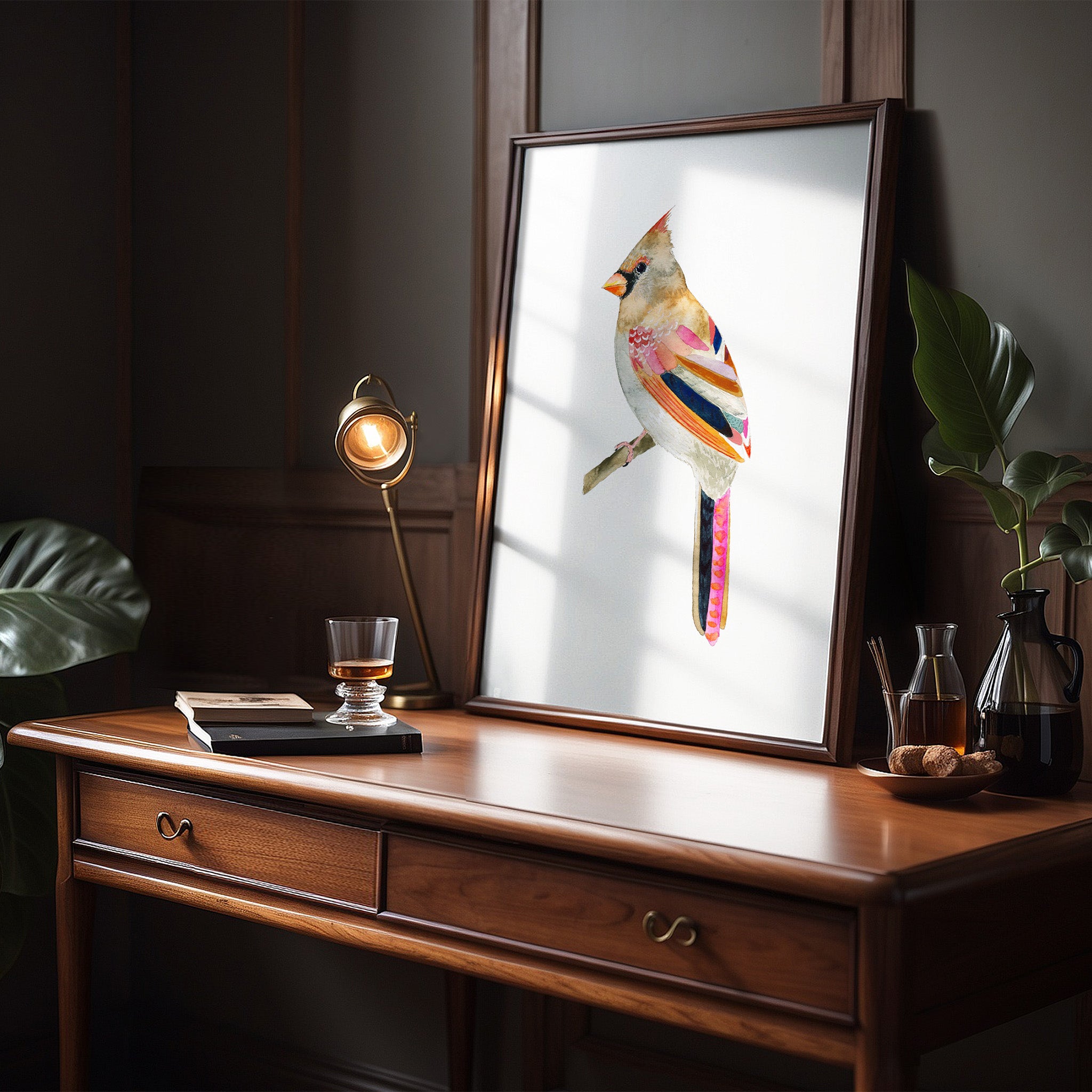 This is an archival fine art print of my original female Cardinal watercolor painting.   If you'd like to pair her with the red male cardinal, click here to see the print set!  (see third photo)We offer in-house framing using real oak wood (natural, walnut, or white) or gold metal and all frames come with crystal-clear tempered glass. Framed prints arrive at your door fully framed and ready to hang with all necessary hardware.For unframed prints, all size options are standard and come ready to be placed into any standard frame.Each print is made with archival pigment-based ink on 100% cotton paper.Unframed prints are thoughtfully packaged with firm backing board in a clear protective sleeve. Larger prints are shipped in a sturdy mailing tube.Framed prints are carefully double-boxed with bubble wrap to amply protect the frame and glass while on the shipping journey.