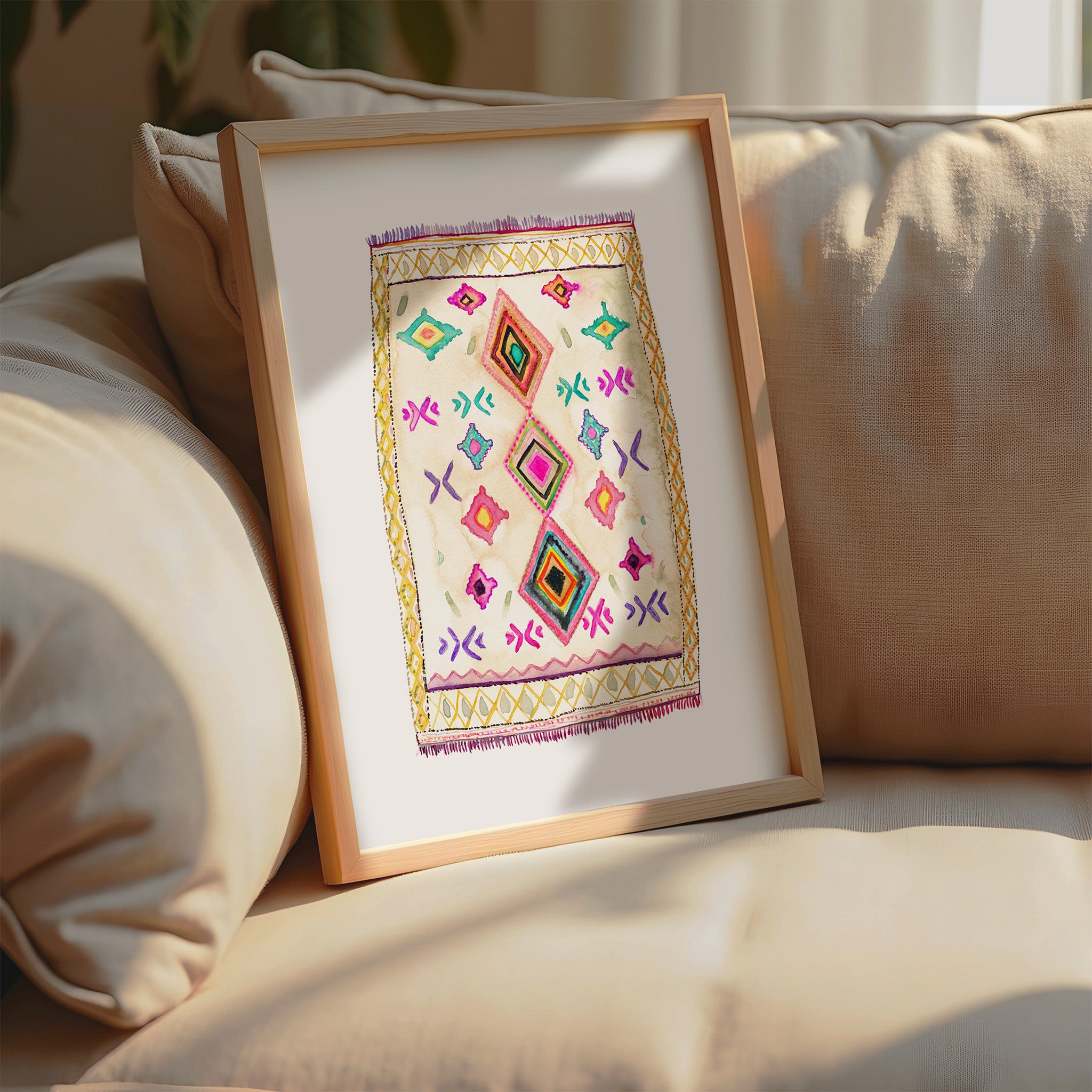 This is an archival fine art print of my original watercolor vintage rug painting.We offer in-house framing using real oak wood (natural, walnut, or white) or gold metal and all frames come with crystal-clear tempered glass. Framed prints arrive at your door fully framed and ready to hang with all necessary hardware.For unframed prints, all size options are standard and come ready to be placed into any standard frame.Each print is made with archival pigment-based ink on 100% cotton paper.Unframed prints are thoughtfully packaged with firm backing board in a clear protective sleeve. Larger prints are shipped in a sturdy mailing tube.Framed prints are carefully double-boxed with bubble wrap to amply protect the frame and glass while on the shipping journey.