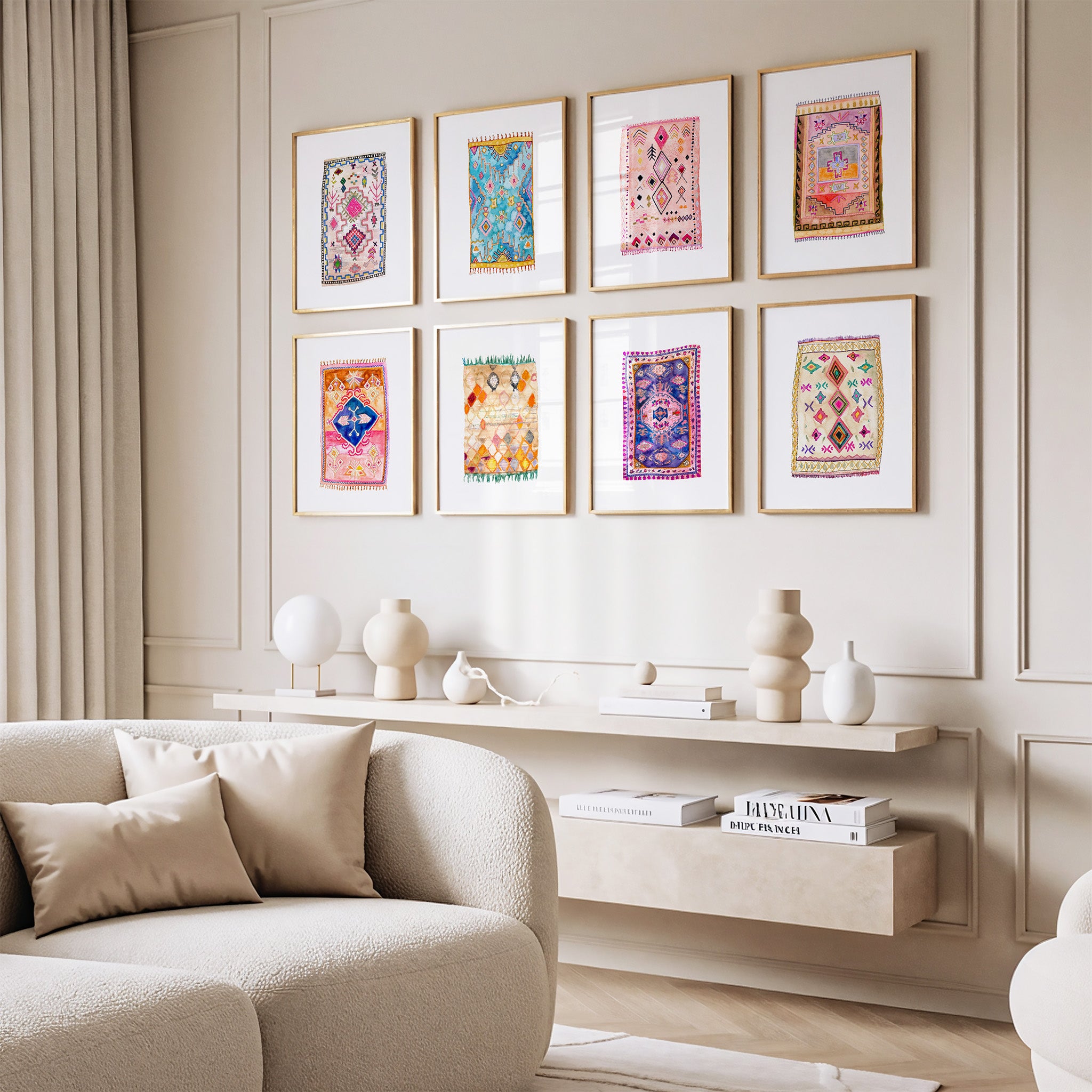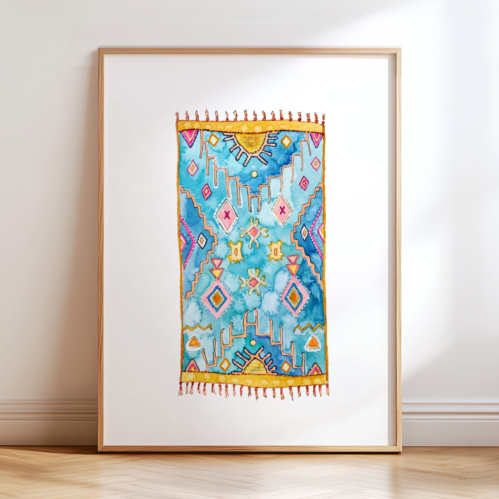 This series was inspired by the breathtaking handwork of rug and basket makers from around the globe. I am in awe of these artists and their magical creations where beauty and functionality meet. I hope that my painterly rendition of this rug will bring a sense of joy to your space!