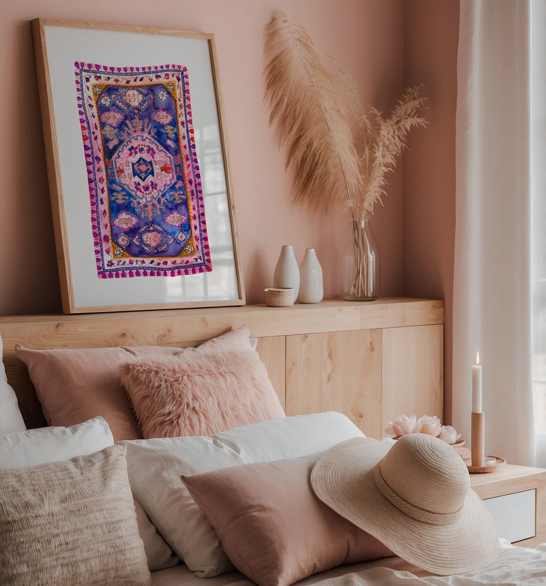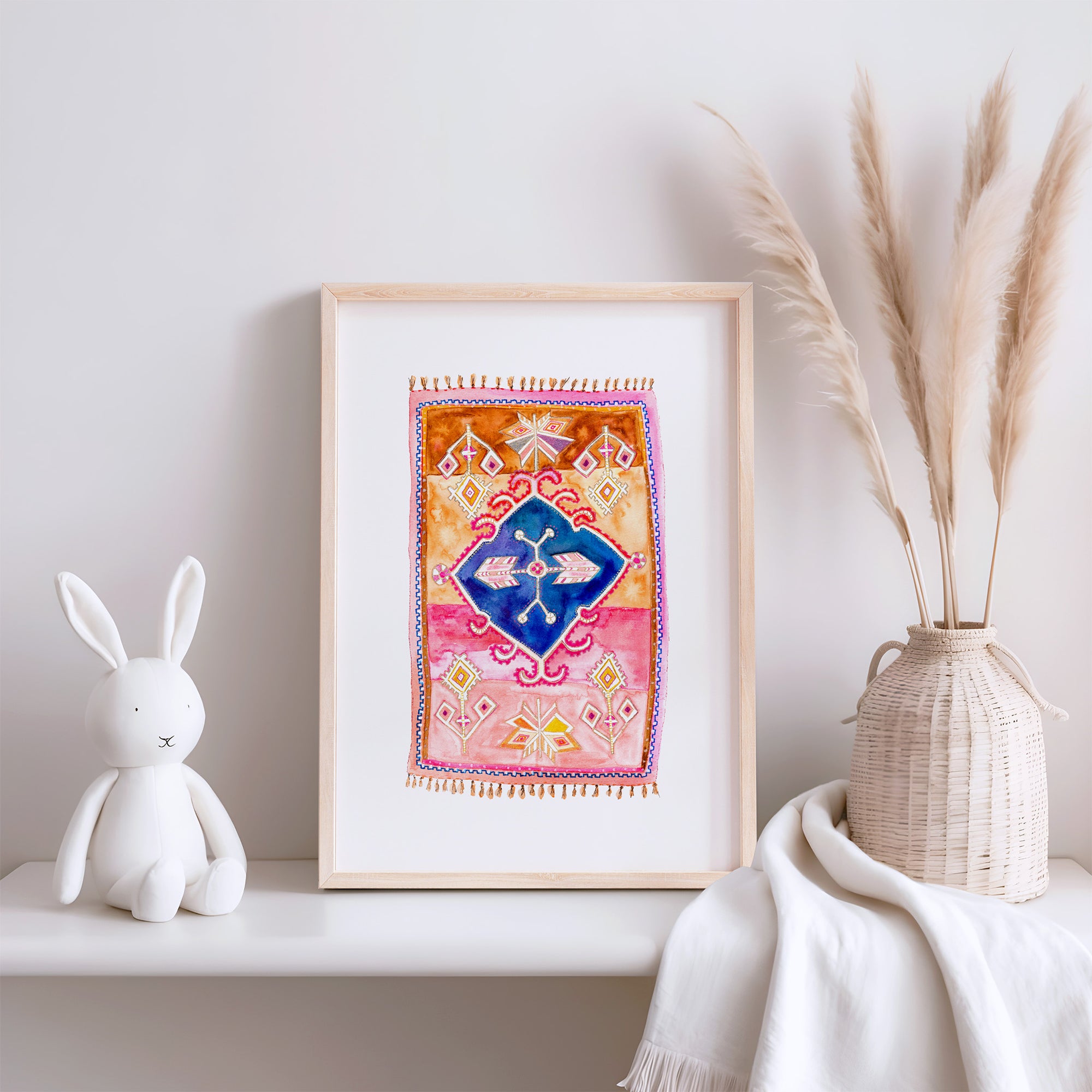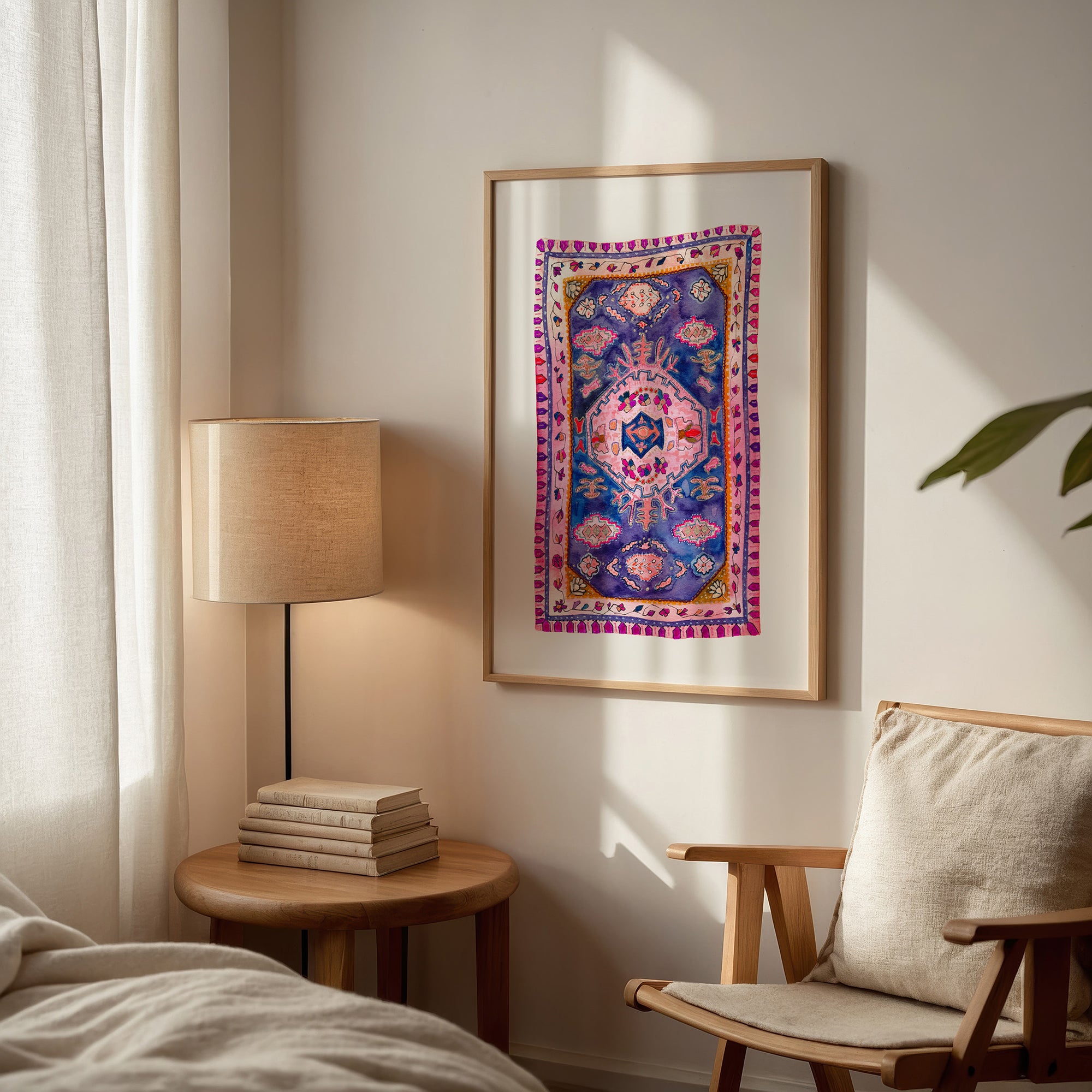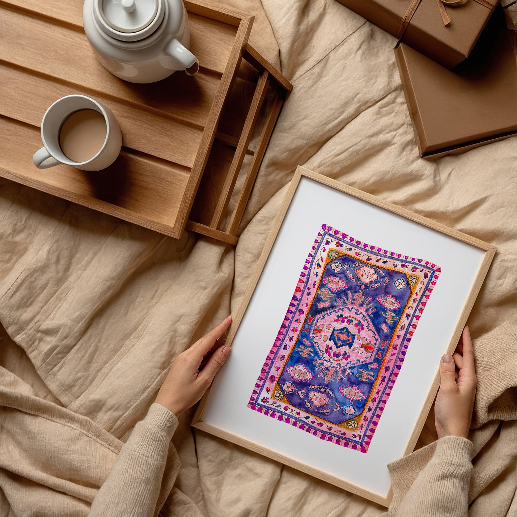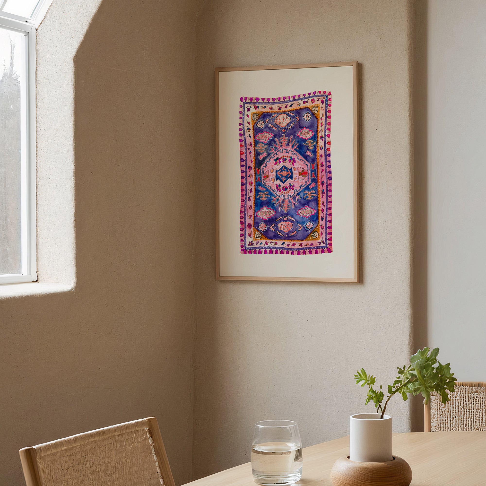 This series was inspired by the breathtaking handwork of rug makers from around the globe. I am in awe of these artists and their magical creations where beauty and functionality meet. I hope that my painterly rendition of this rug will bring a sense of joy to your space!