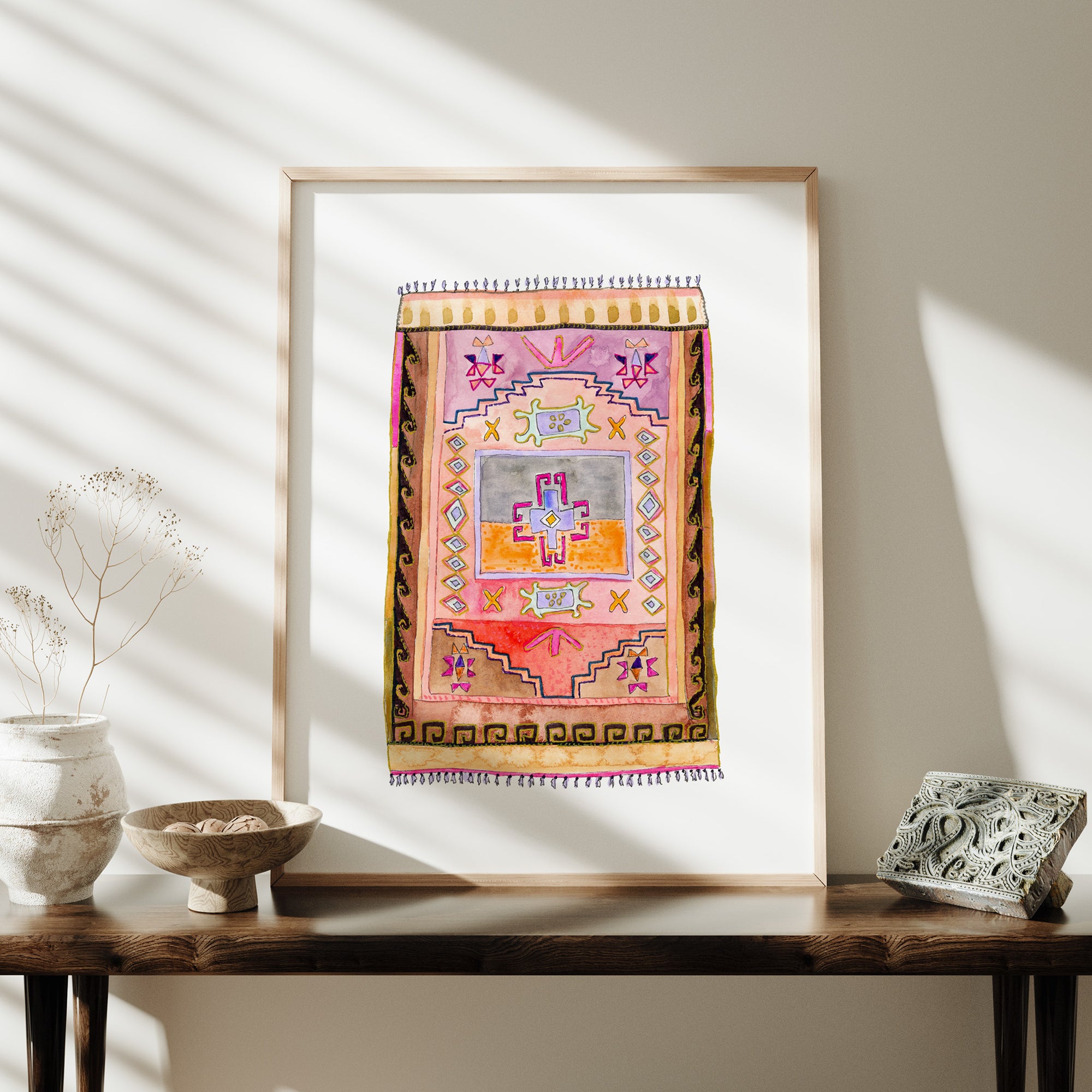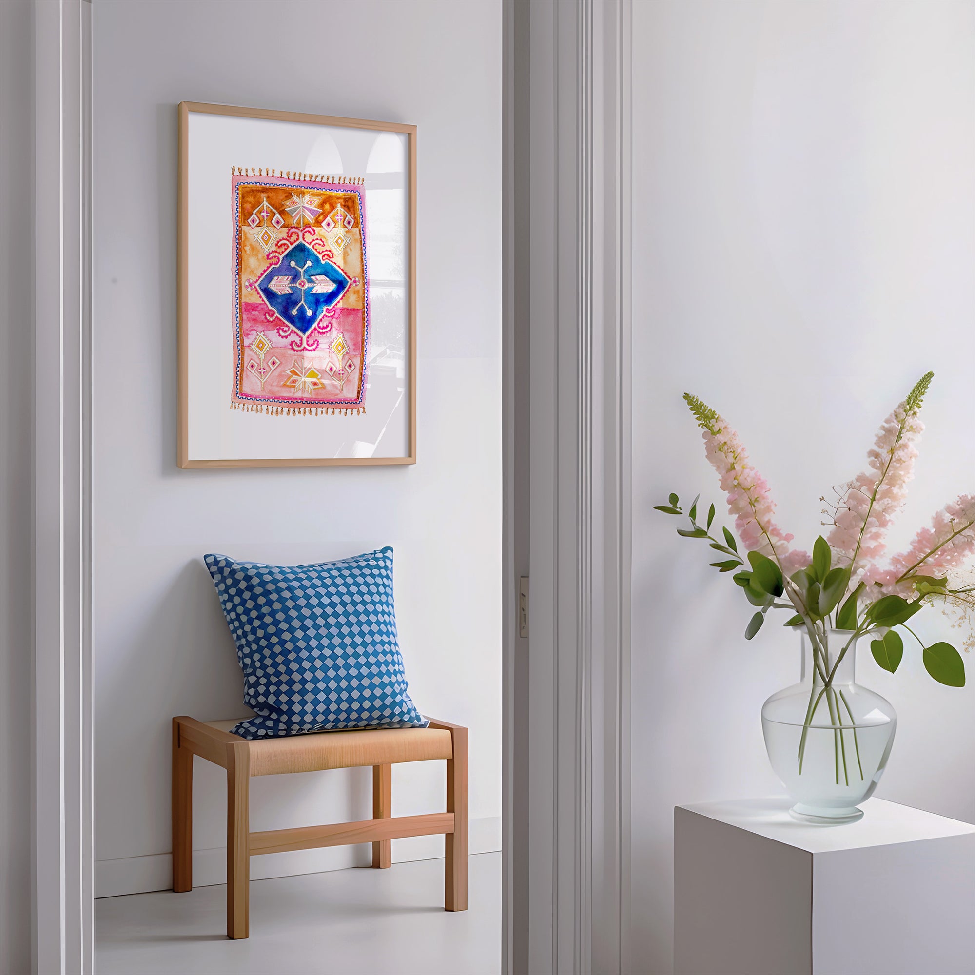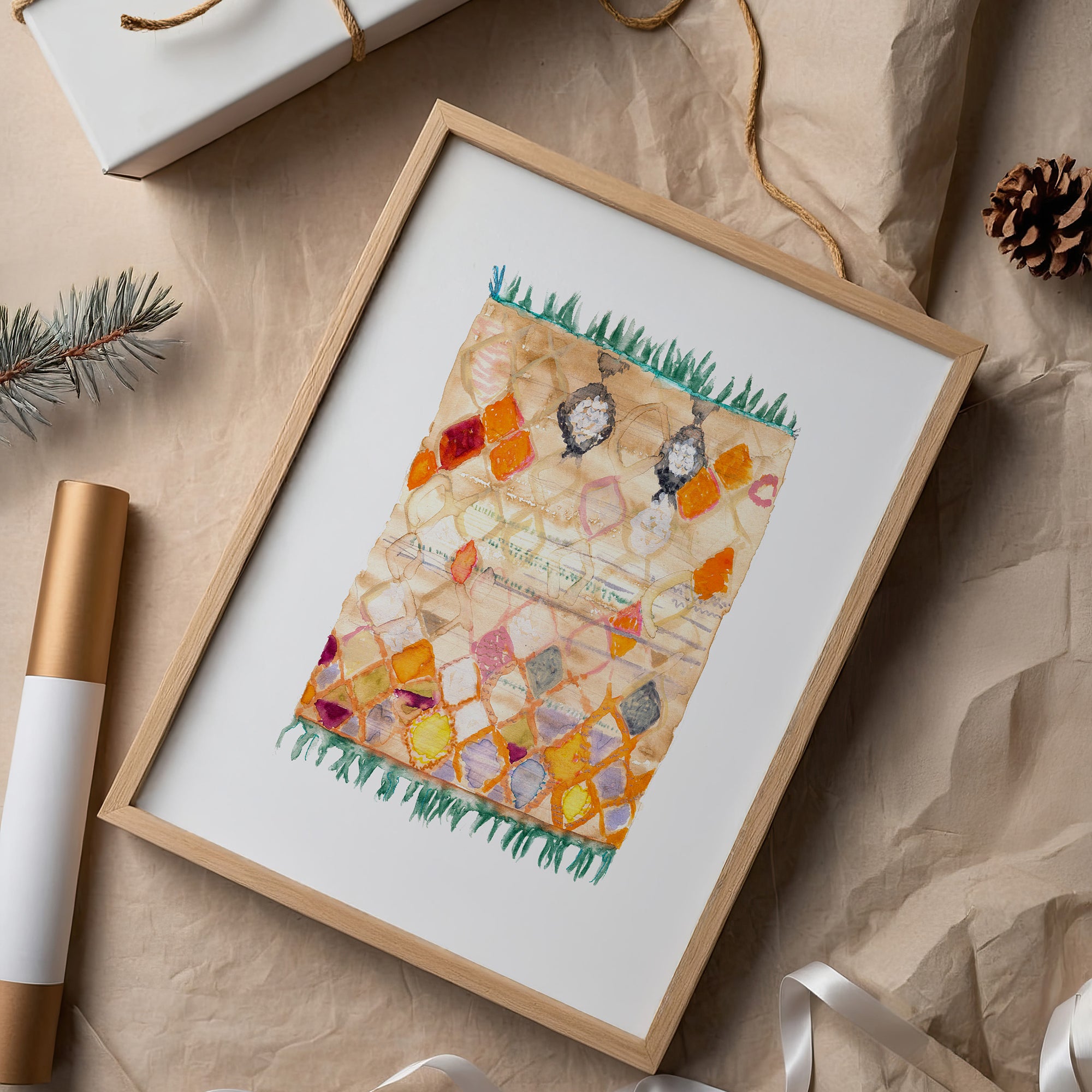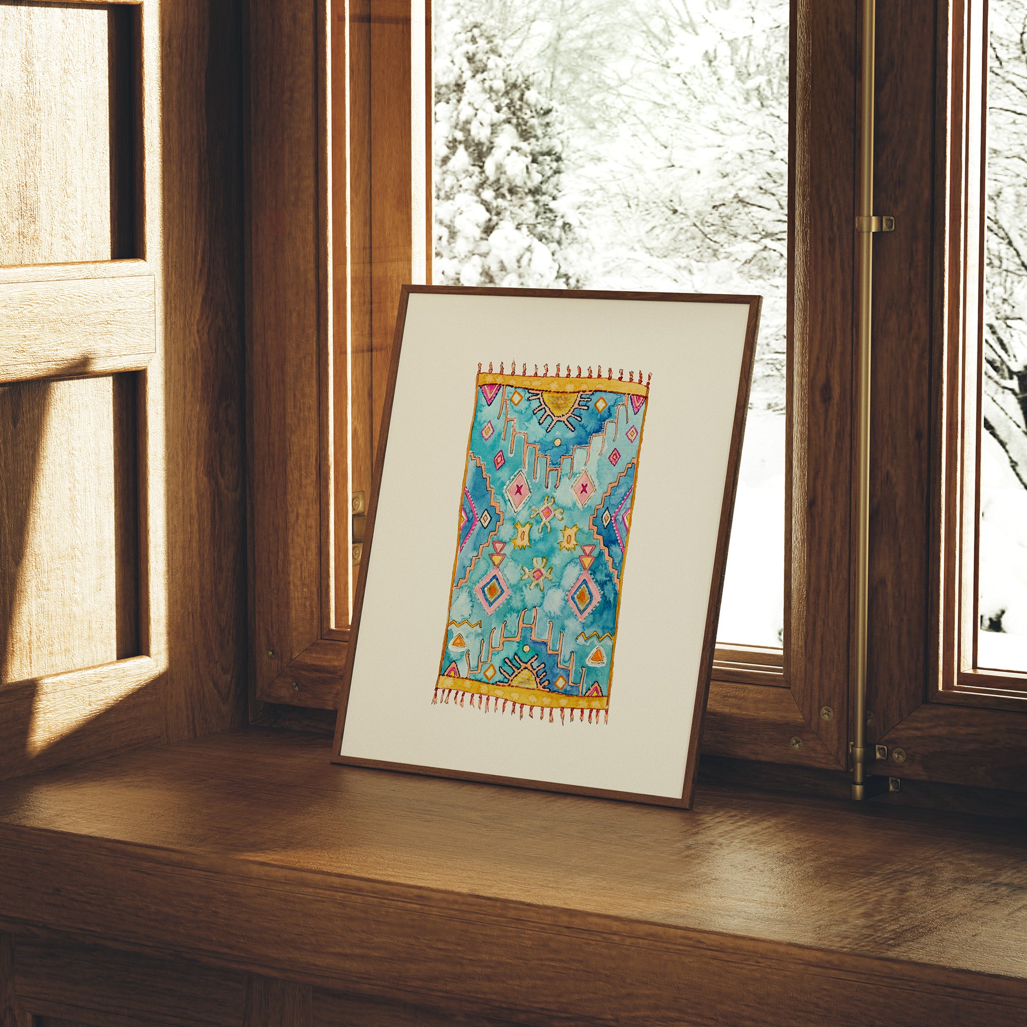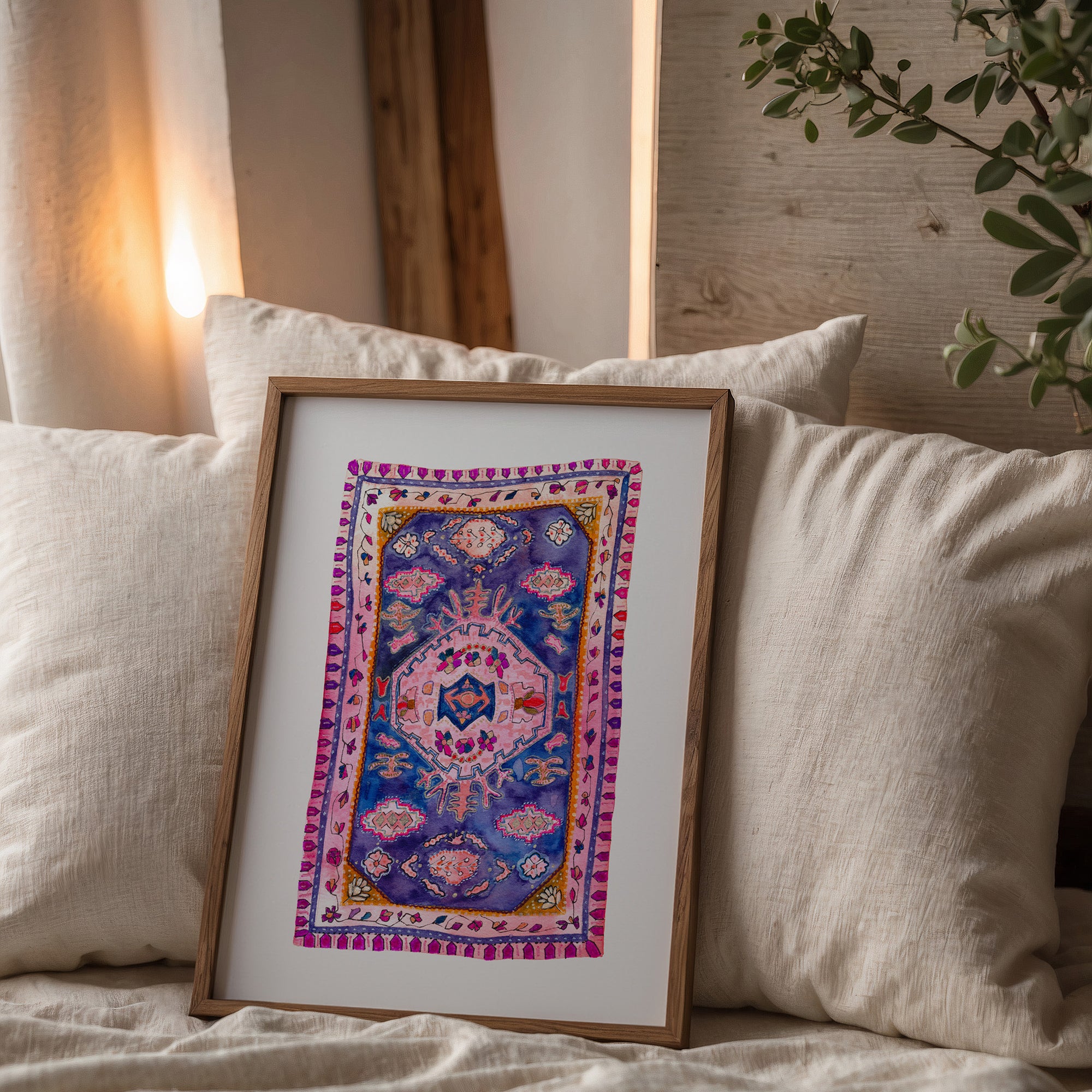 This series was inspired by the breathtaking handwork of rug makers from around the globe. I am in awe of these artists and their magical creations where beauty and functionality meet. I hope that my painterly rendition of this rug will bring a sense of joy to your space!