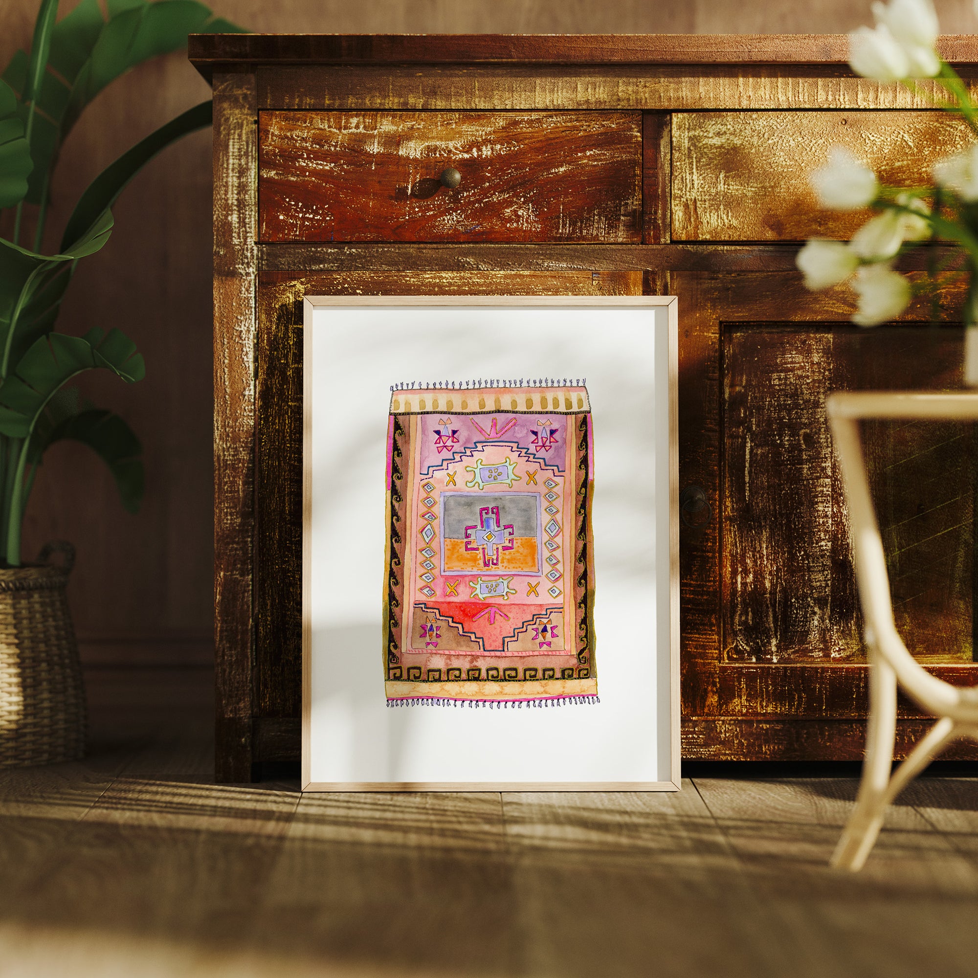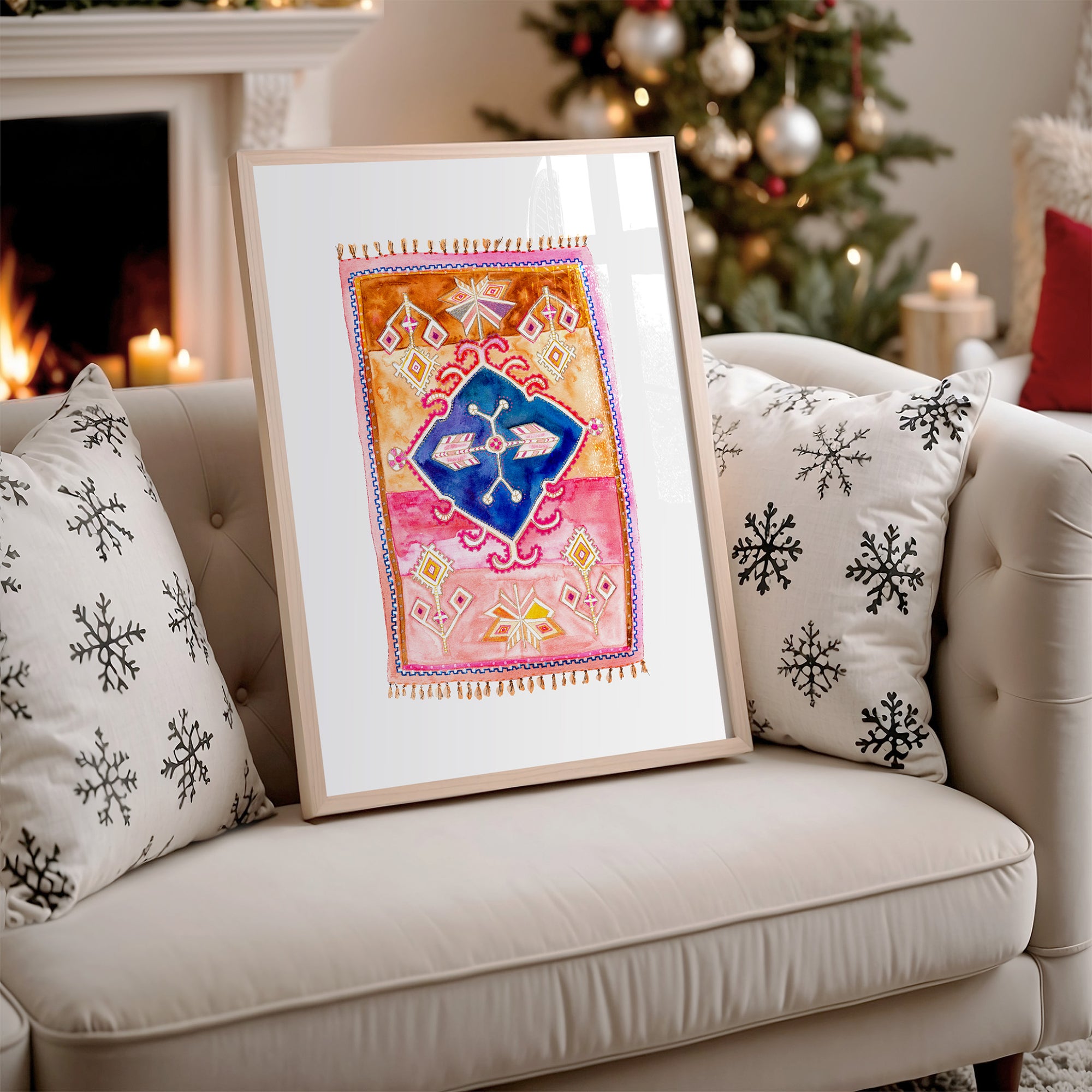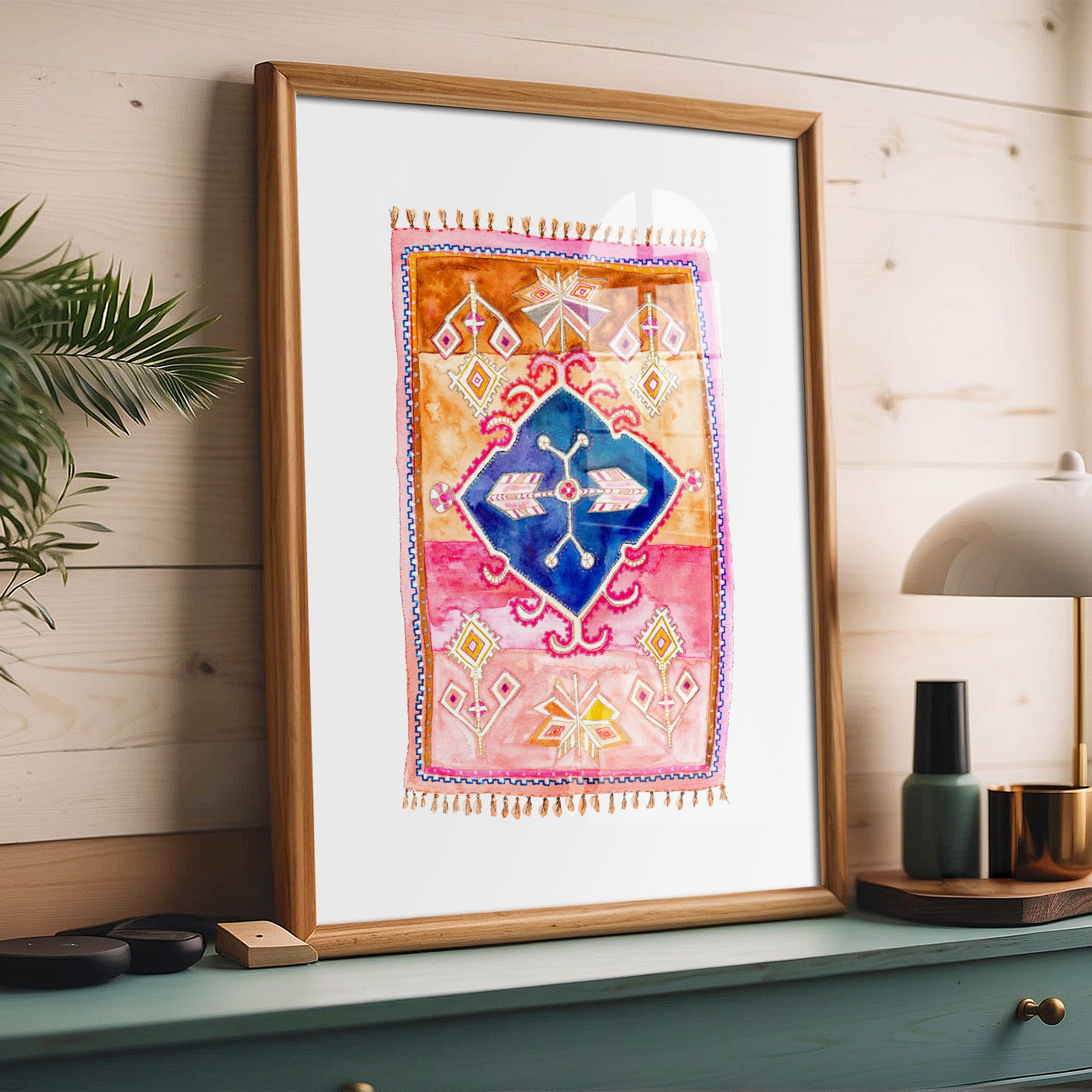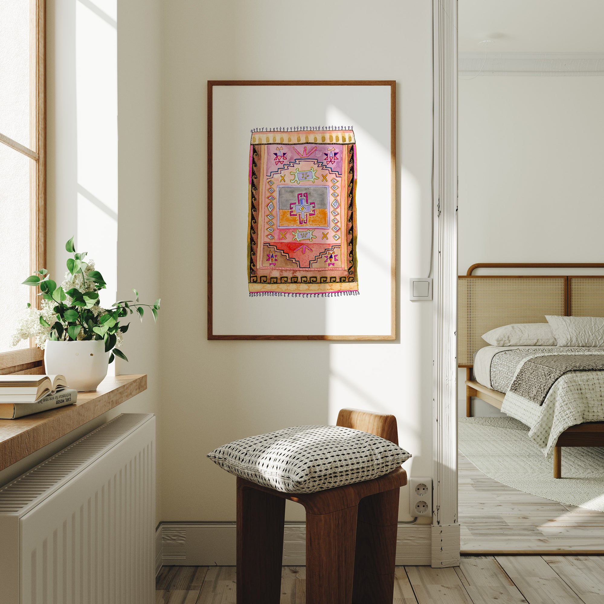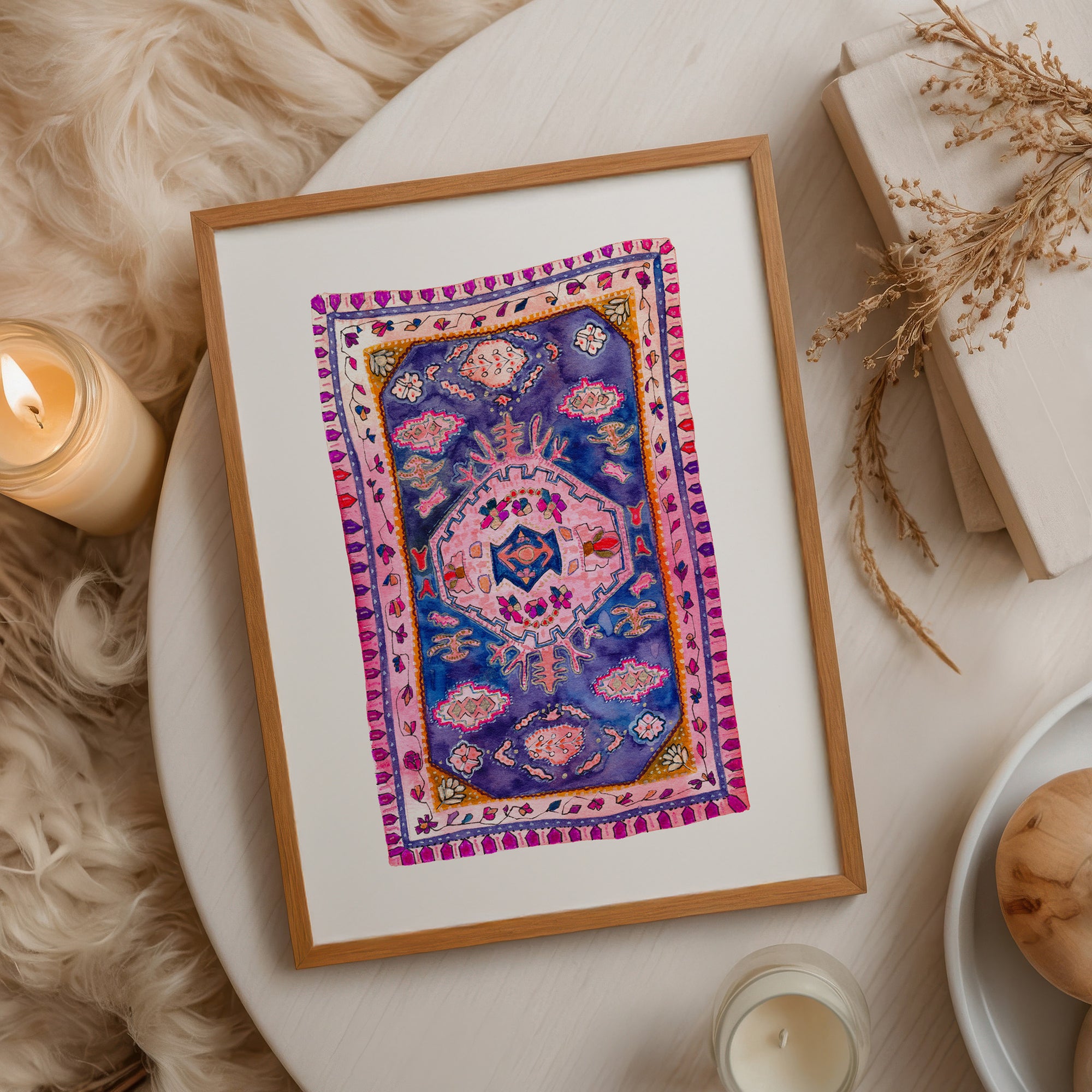 This series was inspired by the breathtaking handwork of rug makers from around the globe. I am in awe of these artists and their magical creations where beauty and functionality meet. I hope that my painterly rendition of this rug will bring a sense of joy to your space!