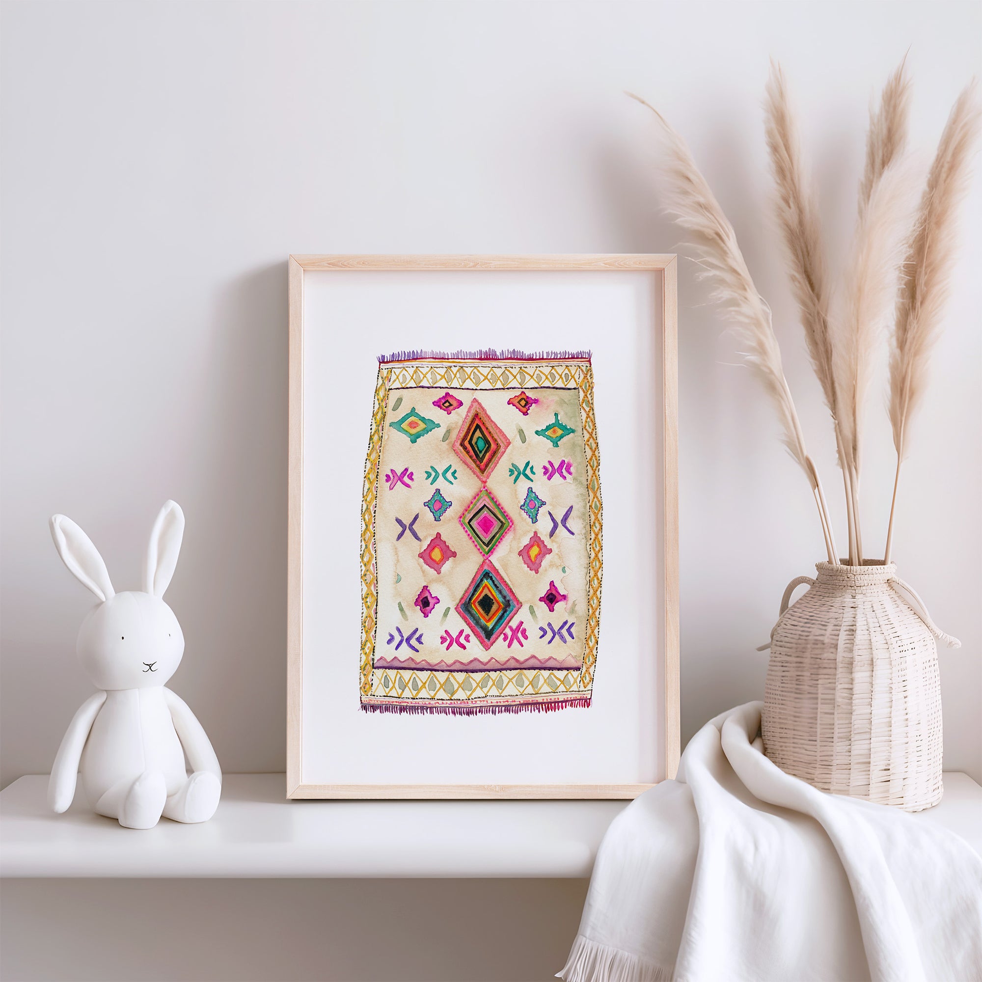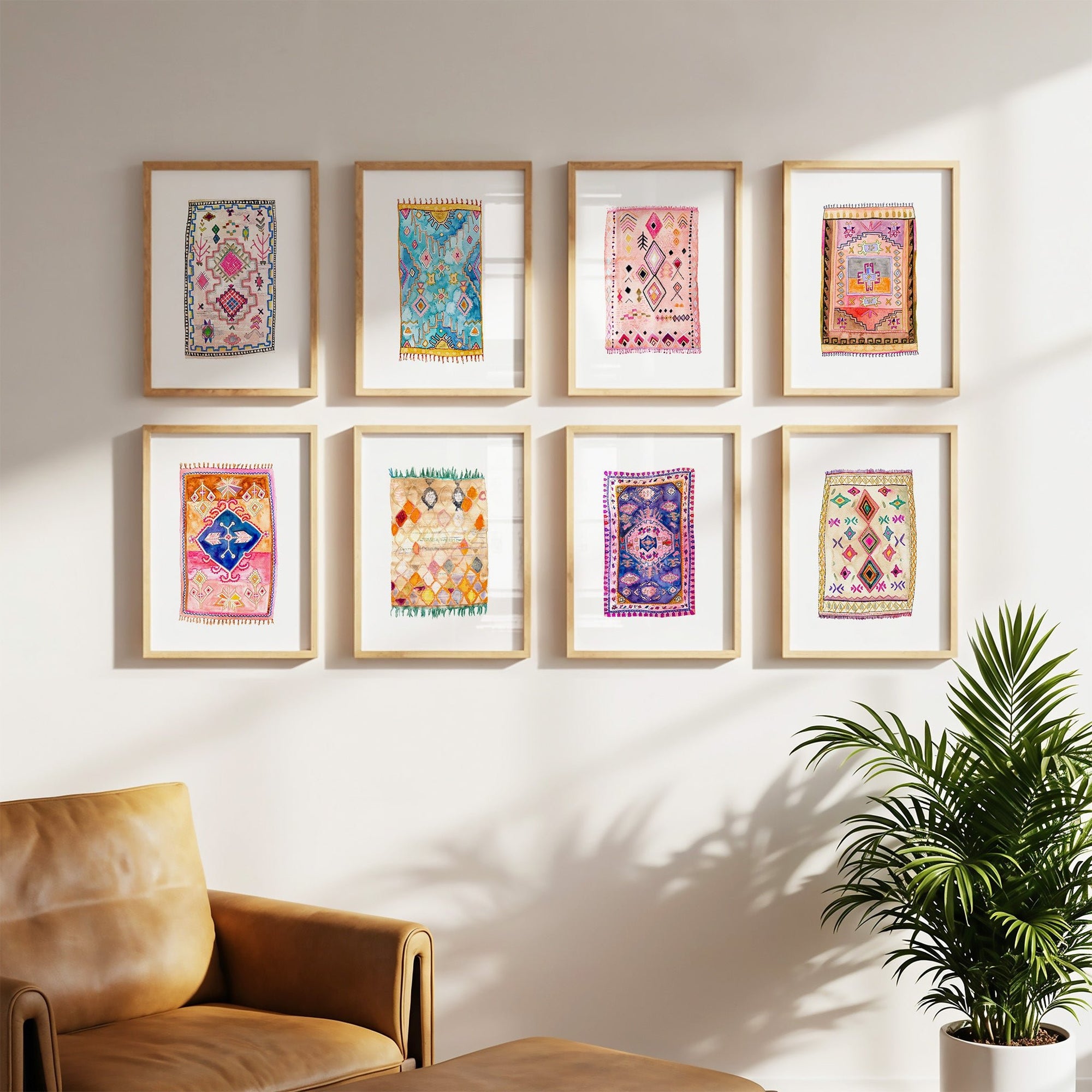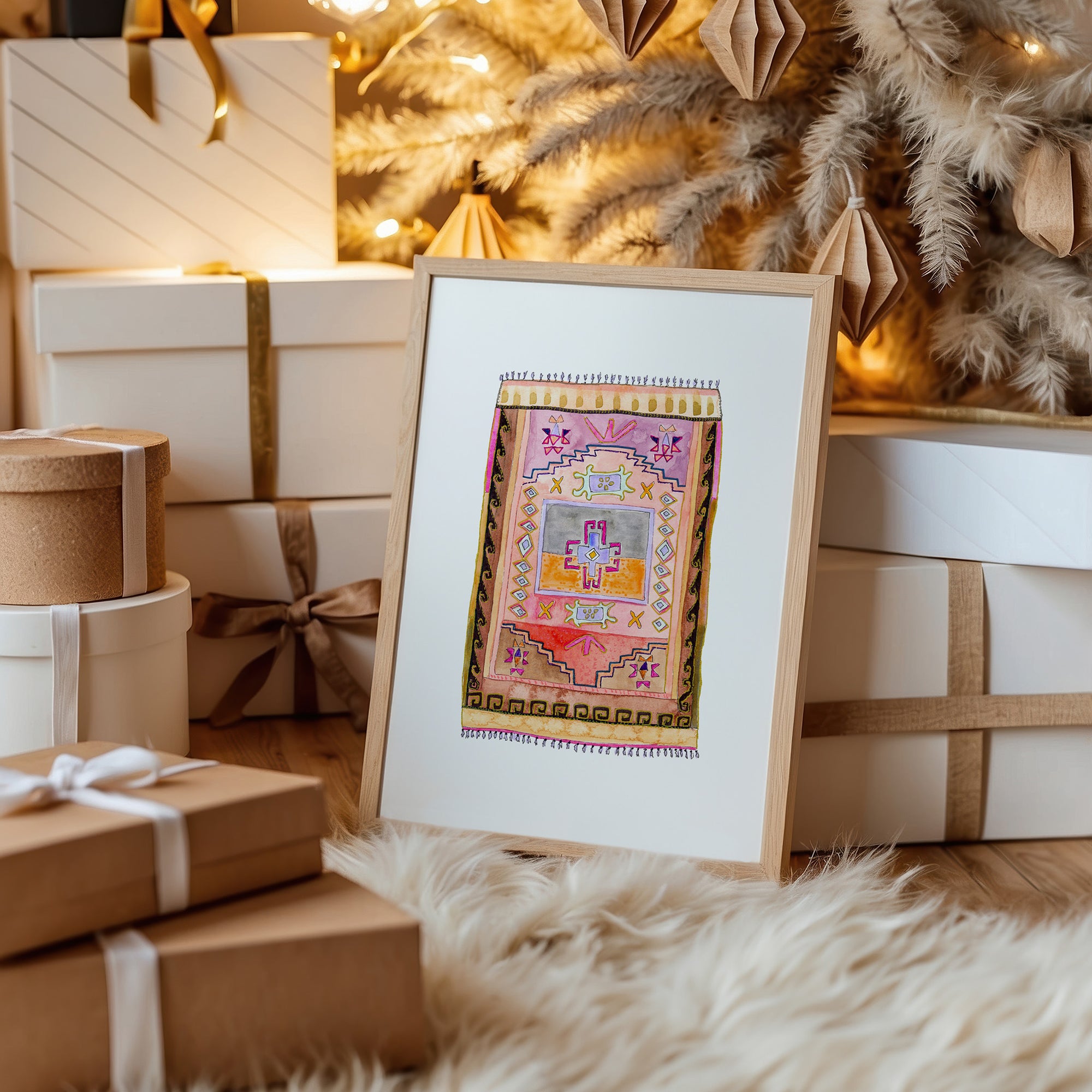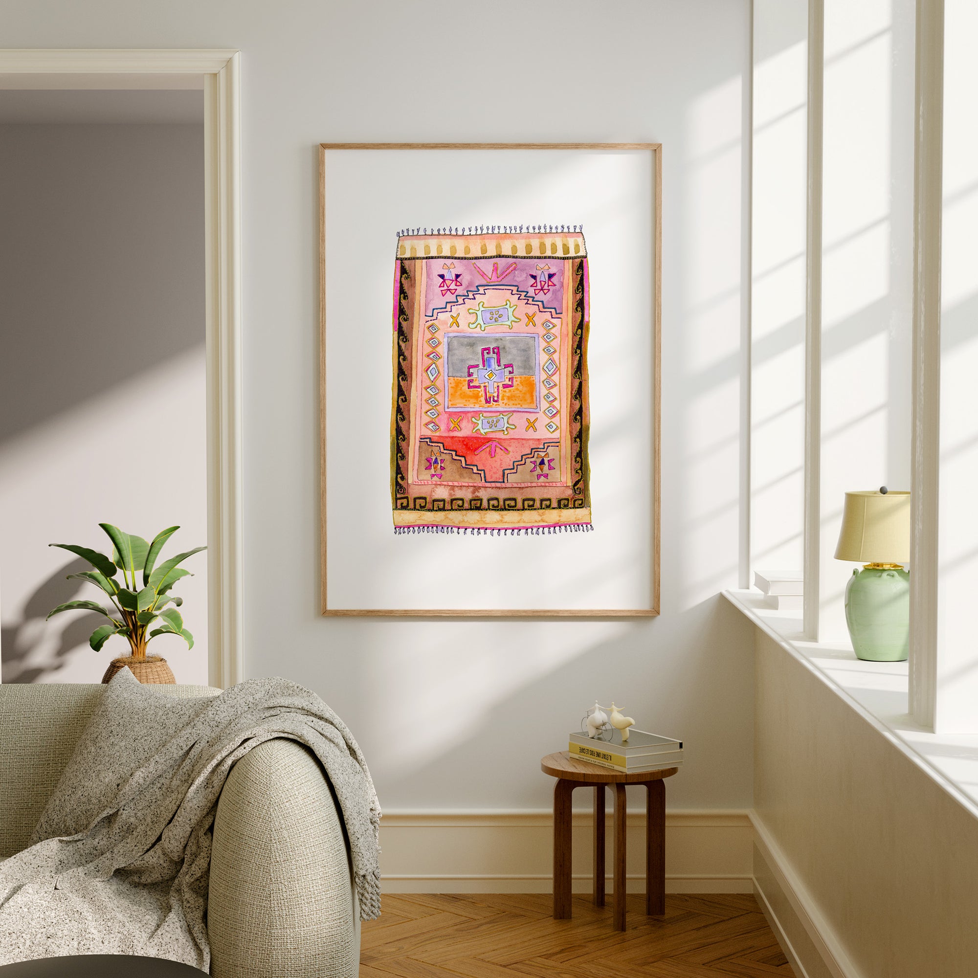 This series was inspired by the breathtaking handwork of rug makers from around the globe. I am in awe of these artists and their magical creations where beauty and functionality meet. I hope that my painterly rendition of this rug will bring a sense of joy to your space!