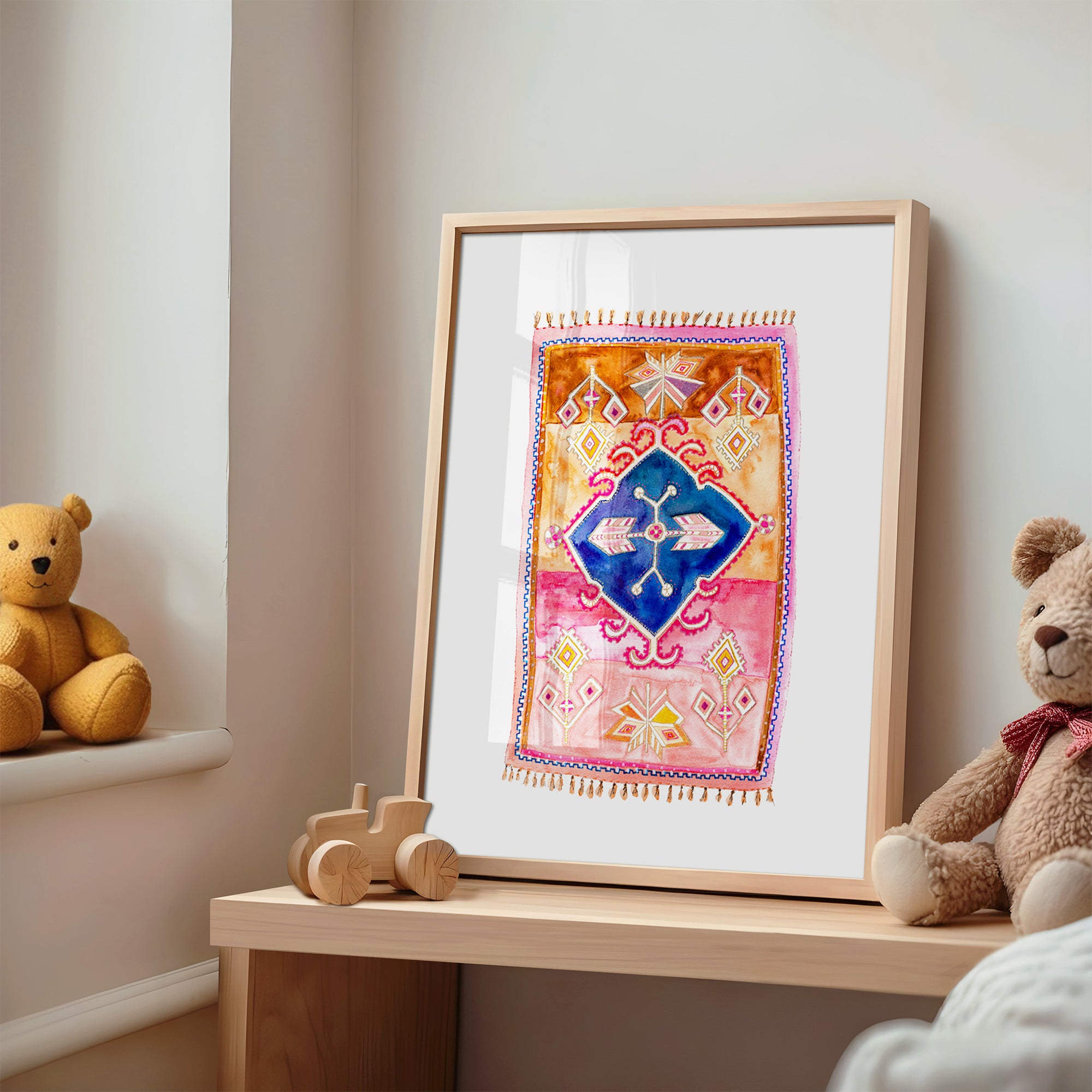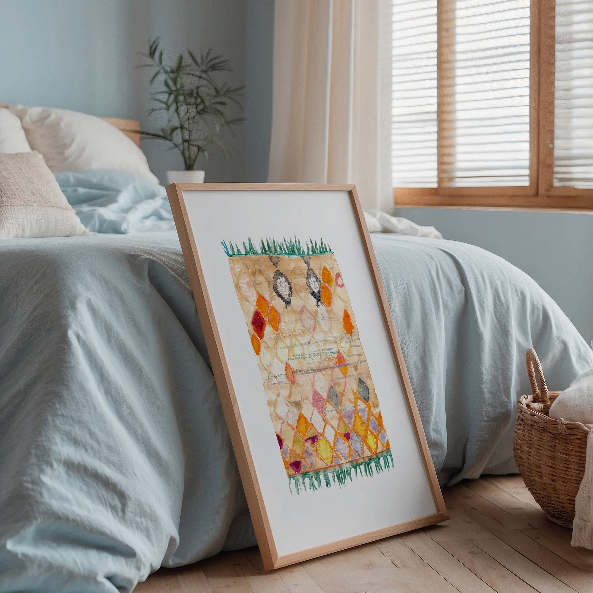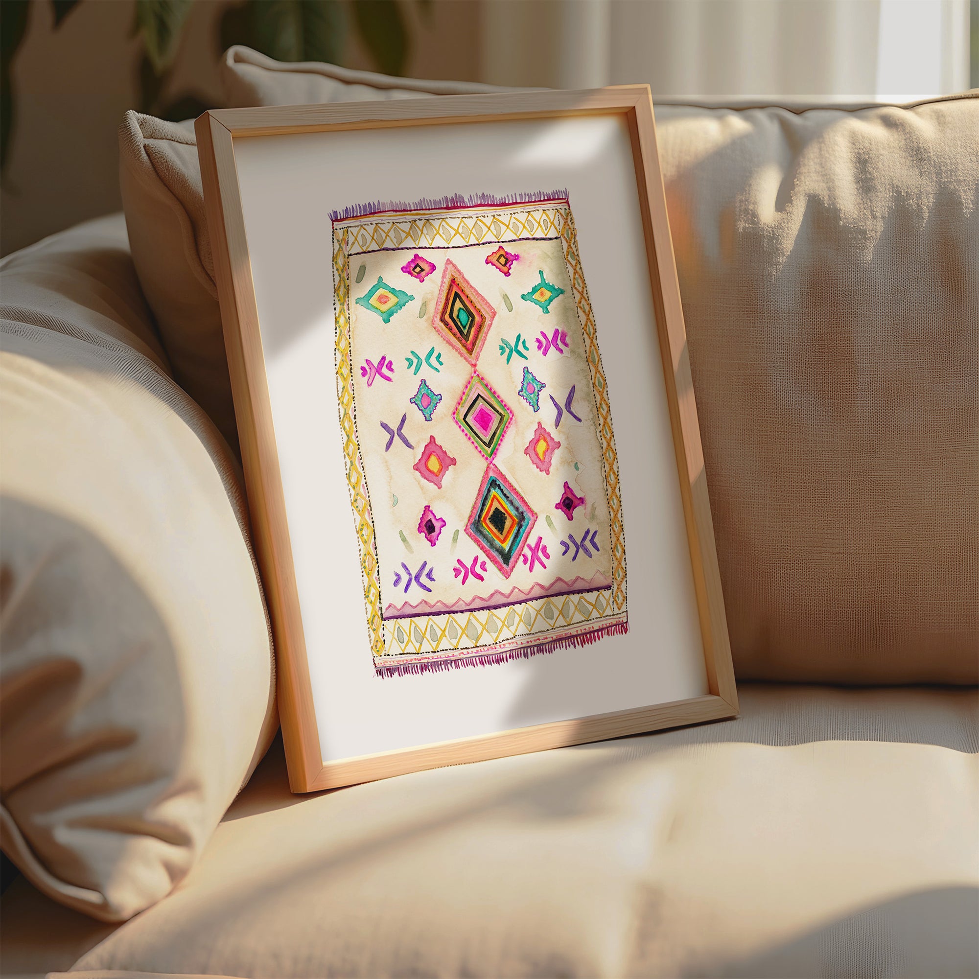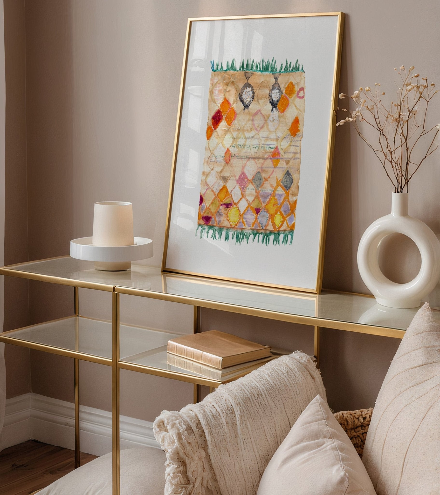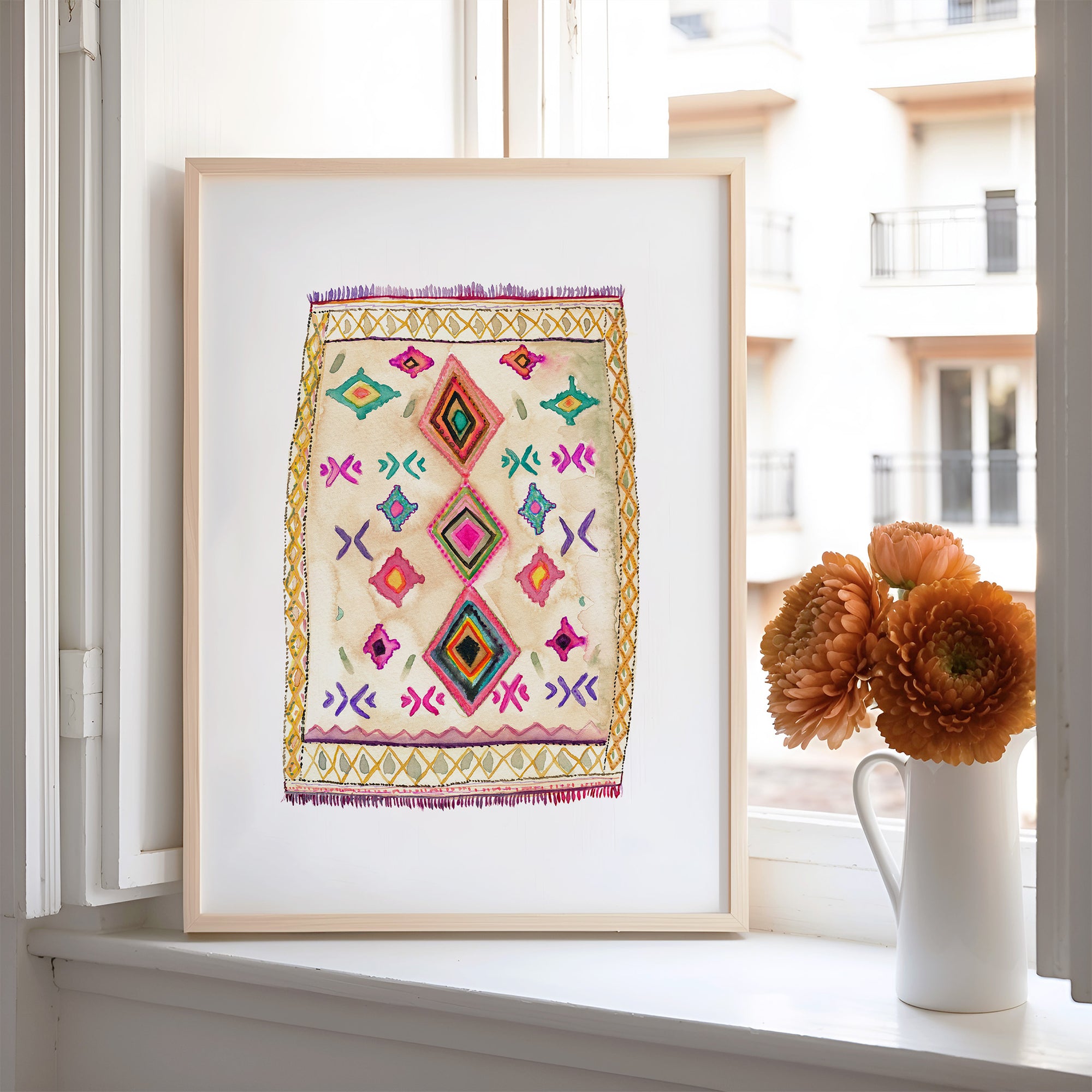This series was inspired by the breathtaking handwork of rug makers from around the globe. I am in awe of these artists and their magical creations where beauty and functionality meet. I hope that my painterly rendition of this rug will bring a sense of joy to your space!