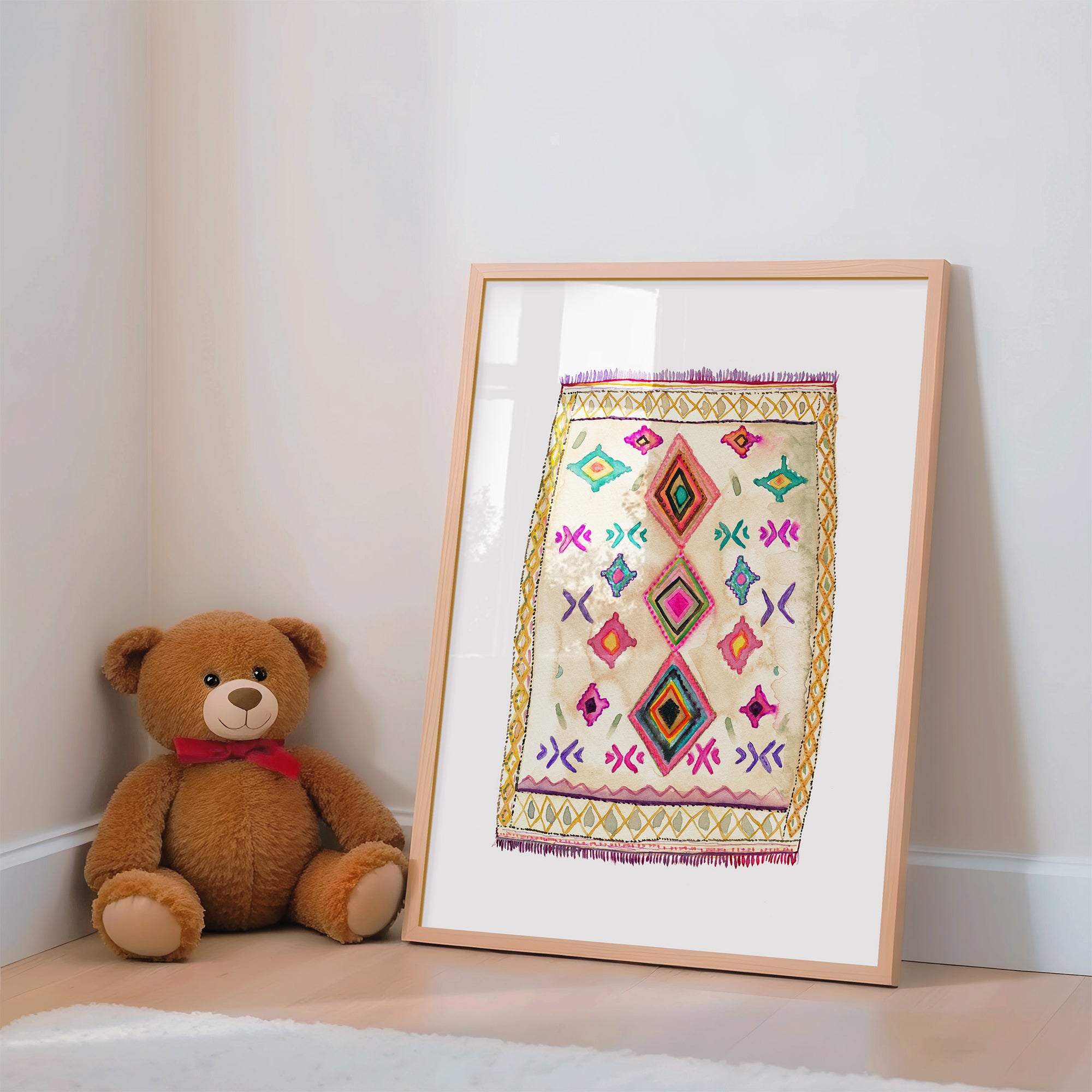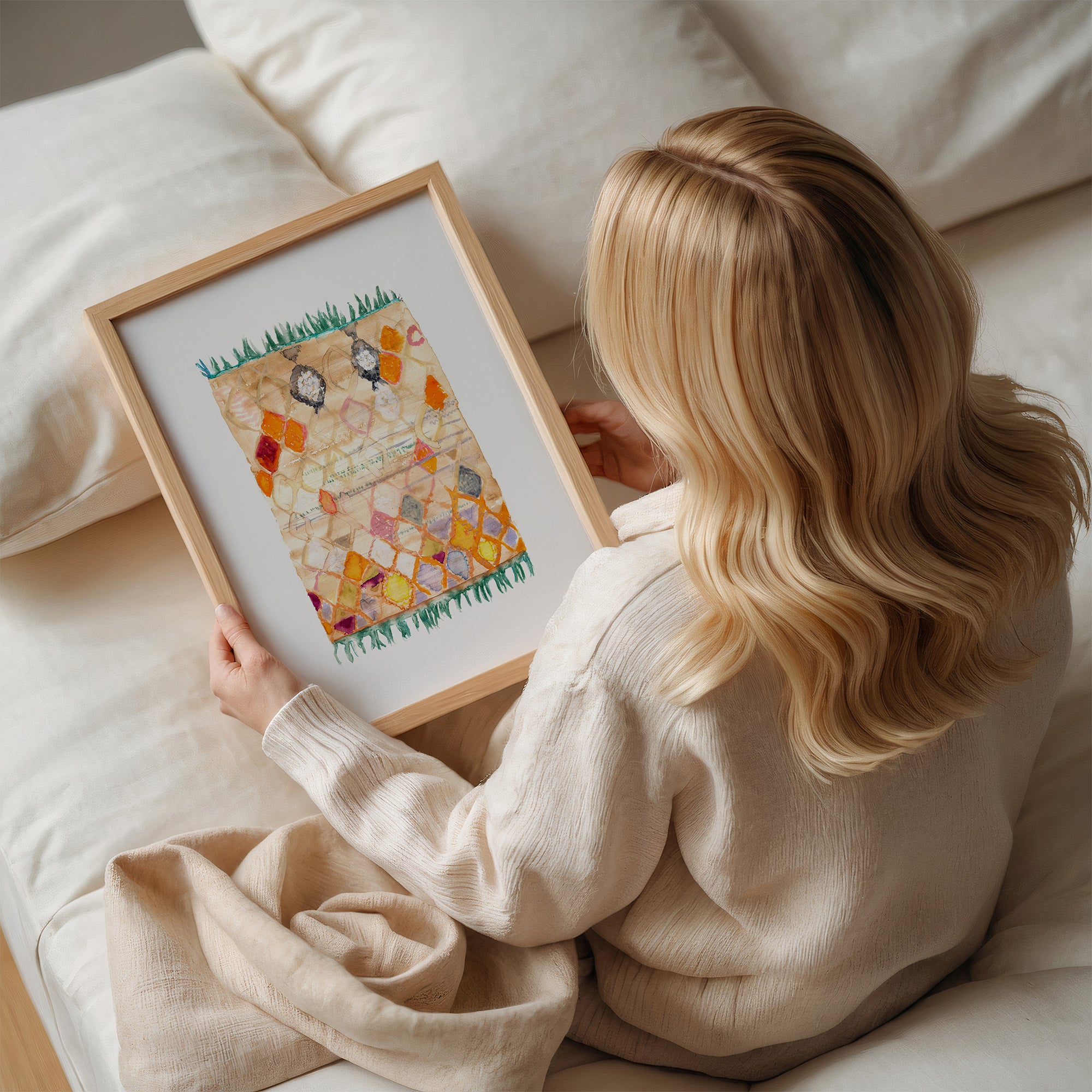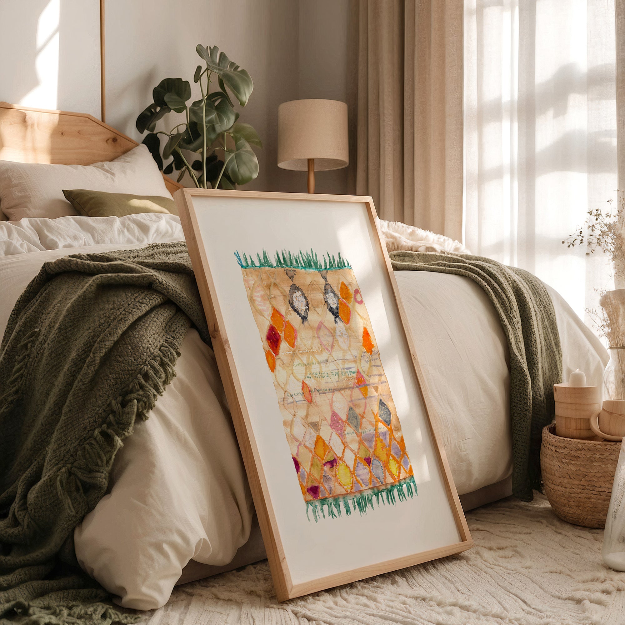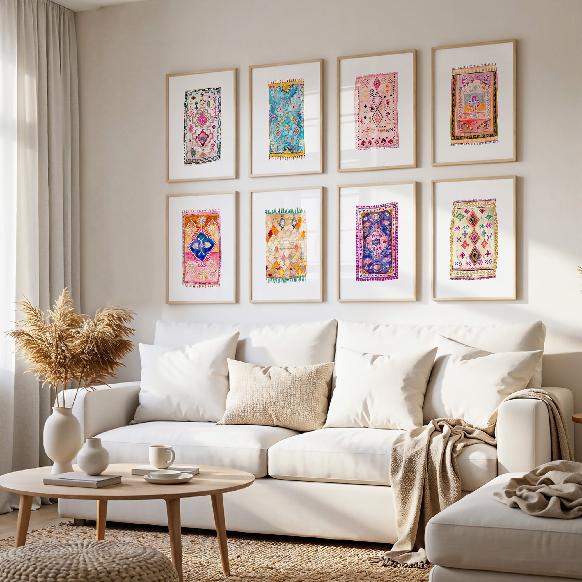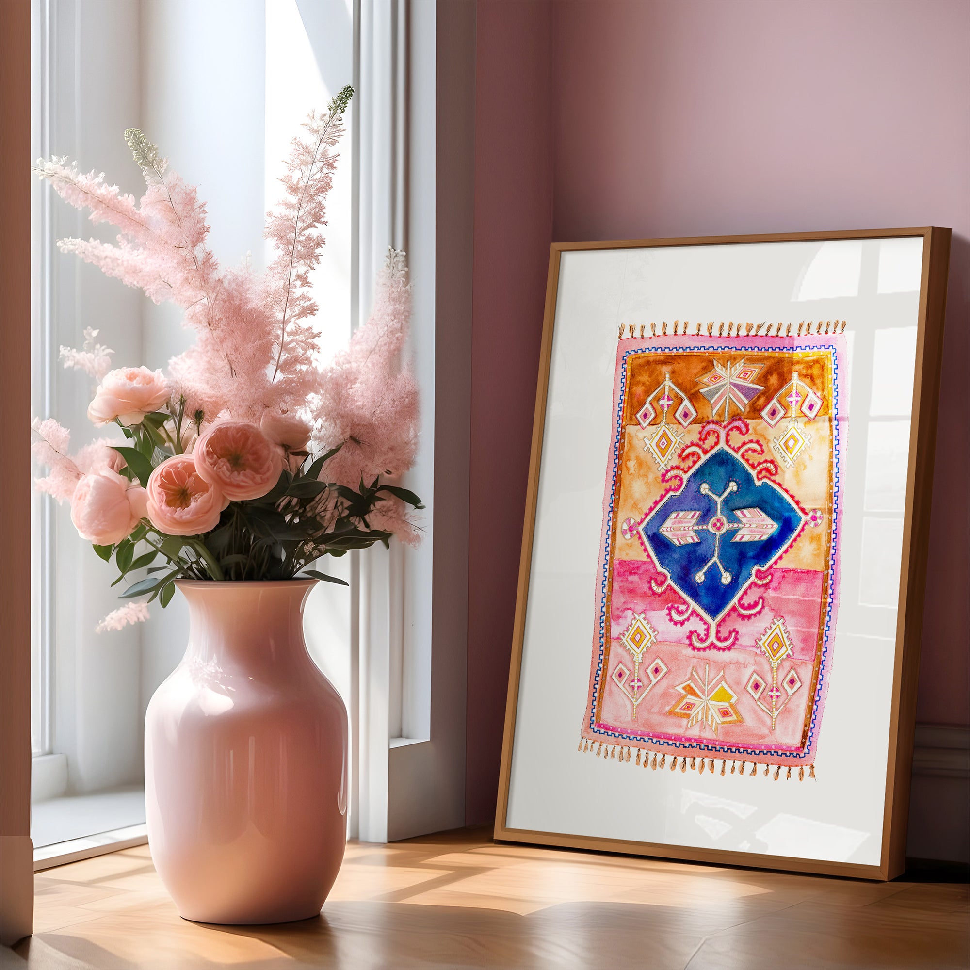This series was inspired by the breathtaking handwork of rug makers from around the globe. I am in awe of these artists and their magical creations where beauty and functionality meet. I hope that my painterly rendition of this rug will bring a sense of joy to your space!